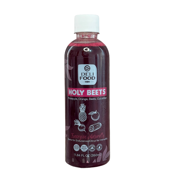 Experience earthy sweetness with Delifood’s HOLY BEETS. This cold-pressed juice features beets, carrots, pineapple, and a hint of ginger—an energizing blend that awakens your senses and supports your body.